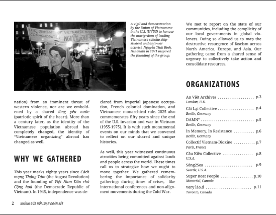 This publication commemorates the first international gathering of its kind—of Vietnamese community organizers and political activists in the UK, France, US, Canada, and Germany on March 21st, 2025. It was crucial for us to archive this gathering because such community histories are often erased, hidden, or lost.